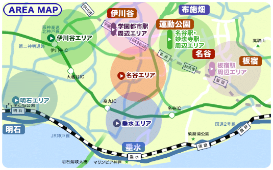 県立大生専用マンションや家賃割引制度のお部屋など新入生に安心してお選びいただけるお部屋があります。食料品の買い物や外食には困らないエリアです。有名な「魚の棚」(うおんたなと読みます。)という、とても賑やかな市場が近くにあります。料理好きな学生にはいいかもしれません。暖かい人情あふれる町です。駅前には明石城跡公園、市立図書館(学習室有り)、県立図書館があり、休日に利用することができます。学園都市への通学はバス利用して地下鉄の伊川谷駅へ、伊川谷からは地下鉄で、あるいはJRを利用して舞子駅からバスで通学できます。距離はありますが、原付での通学も可能です。